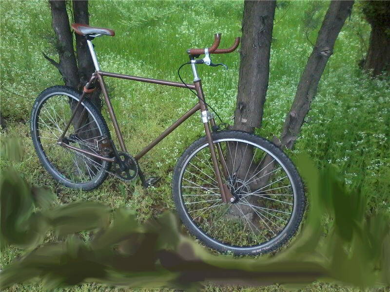 Рама:Украина, В -76, т.е модель 1976-го года, пайка латунью, перемычки задних перьев - верхняя - труба, нижняя - полтрубы разрезанные вдоль. Это отнюдь не тот вареный пластилин, что выпускался позднее под именем "Украины". Досталась с вилкой и родной рулевой, вилку - на полку, рулевую - в дело. Шарики перемеряны, хром чашек - в идеале. Резьбы целые везде, чашки каретки зашли от руки! Кто-то криворукий выкрасил веником краской для стен "советский хаки")), да еще под два слоя грунта - пришлось смыть и зачистить до блеска. За то ему спасибо - рама - как консерва, ржавчины - ни следа! Крашена порошком, цвет - коричневый металлик.
