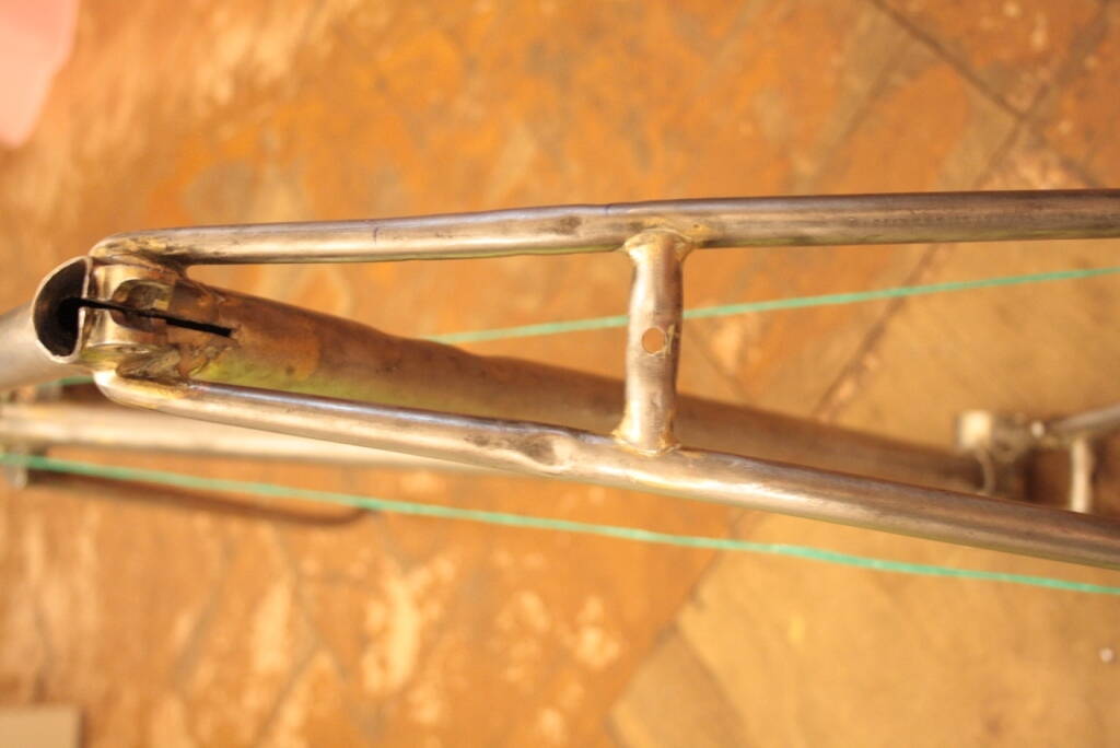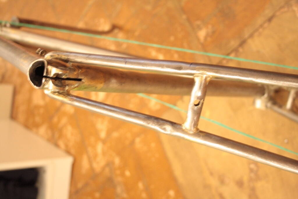 сама рама в относительно хорошем состоянии не считая пары вмятин на подседельной трубе, которые я думаю можно довольно легко исправить.Но больше всего сомнений вызывает задний треугольник. его геометрия явно нарушена причем в какой-то непонятной плоскости. сделал несколько фото, надеюсь по ним будет понятно. так вот вопрос, стоит ли пытаться его ровнять, или сталь 59 года лучше уже не трогать. вел планируется для неагрессивной езды по плоскому городу:)