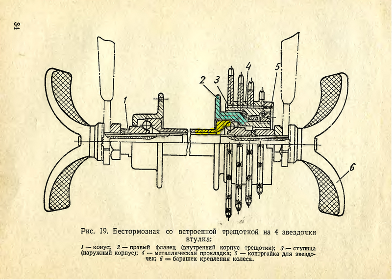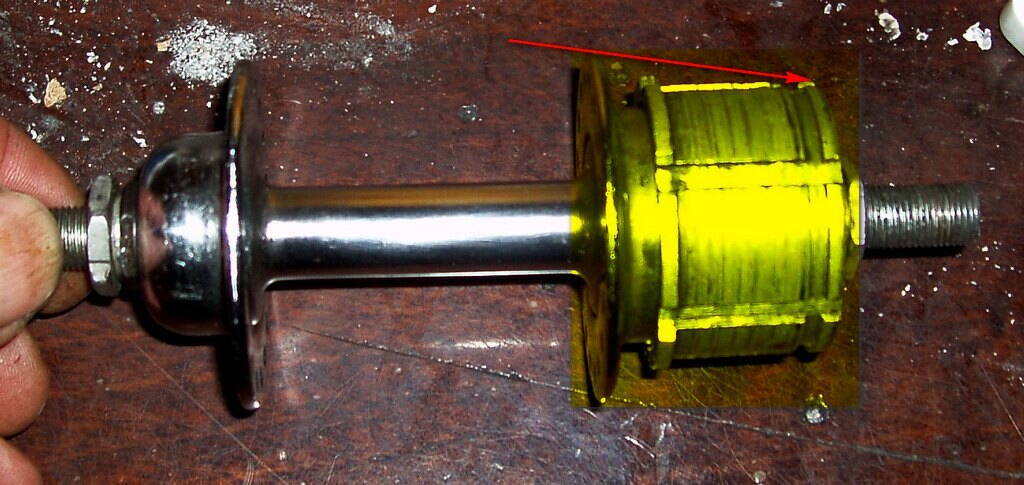 Ну вот моя. Всё, что выделено жёлтым, бьёт эээ.. цельным блоком. Если трещать трещёткой - биения нет, т.е. звёзды относительно фланца не бьют, а играют вместе с ним. Точка, отмеченая стрелкой, колеблется где-то на 1 - 1.5 мм. Ось абсолютно ровная, конуса идеальны - значит и чашки в корпусе втулки стоят правильно.