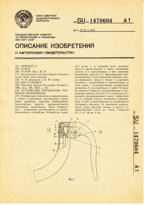 Свой проект "Фотон" хочу сделать эрзац Тахион. И вот нашел инфо про тормозные рукоятки Тахион Аэро. Авторы: Воронцов Р. И., Селин В. М., ЦКТБ велостроения, г. Харьков, СССР. Авторское свидетельство № 1470604, приоритет изобретения № 4292534 от 3 августа 1987 г. Разработаны и изготавливались для специальных («рогатых», lowpro) шоссейных велосипедов для индивидуальных и командных гонок. Экспонировались вместе с велосипедом на выставке в Милане (Milan Bicycle Show) в 1991 году. К рукояткам был проявлен интерес со стороны фирм велопроизводителей участвующих в выставке. Масса одной рукоятки изготовленной из алюминиевого сплава составляет 60 грамм. Также был изготовлен экспериментальный образец рукоятки из высокопрочной пластмассы — масса 30 грамм. Рукоятка прошла испытание и показала свою работоспособность. Всего для различных шоссейных велосипедов «Тахион» было разработано и изготавливалось 3 модели тормозных рукояток. Вложение Вложение Вложение Вложение А какие тормоза устанавливались на Тахион Аэро? Передний устанавливался с другой стороны вилки и важно, что бы не цеплялся о раму при повороте. Какие похожие подойдут тормоза? |
