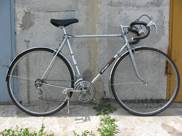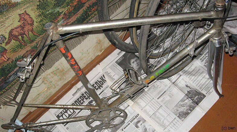 В местной вело-секции нашлась вот такая рама. По описанию хозяина — "чемпион" и "спецзаказ" из 60-х, трубы Reynolds. Оригинальный цвет — возможно, небесно голубой. Хромировалась позже. Петух накладной, похож на самодельный, в последствии приклепан или припаян. На одном из дропаутов видно букву "С", все остальное скрыто под накладкой. Снизу к кареточному узлу прикручивалась пластиковая направляющая для тросиков.