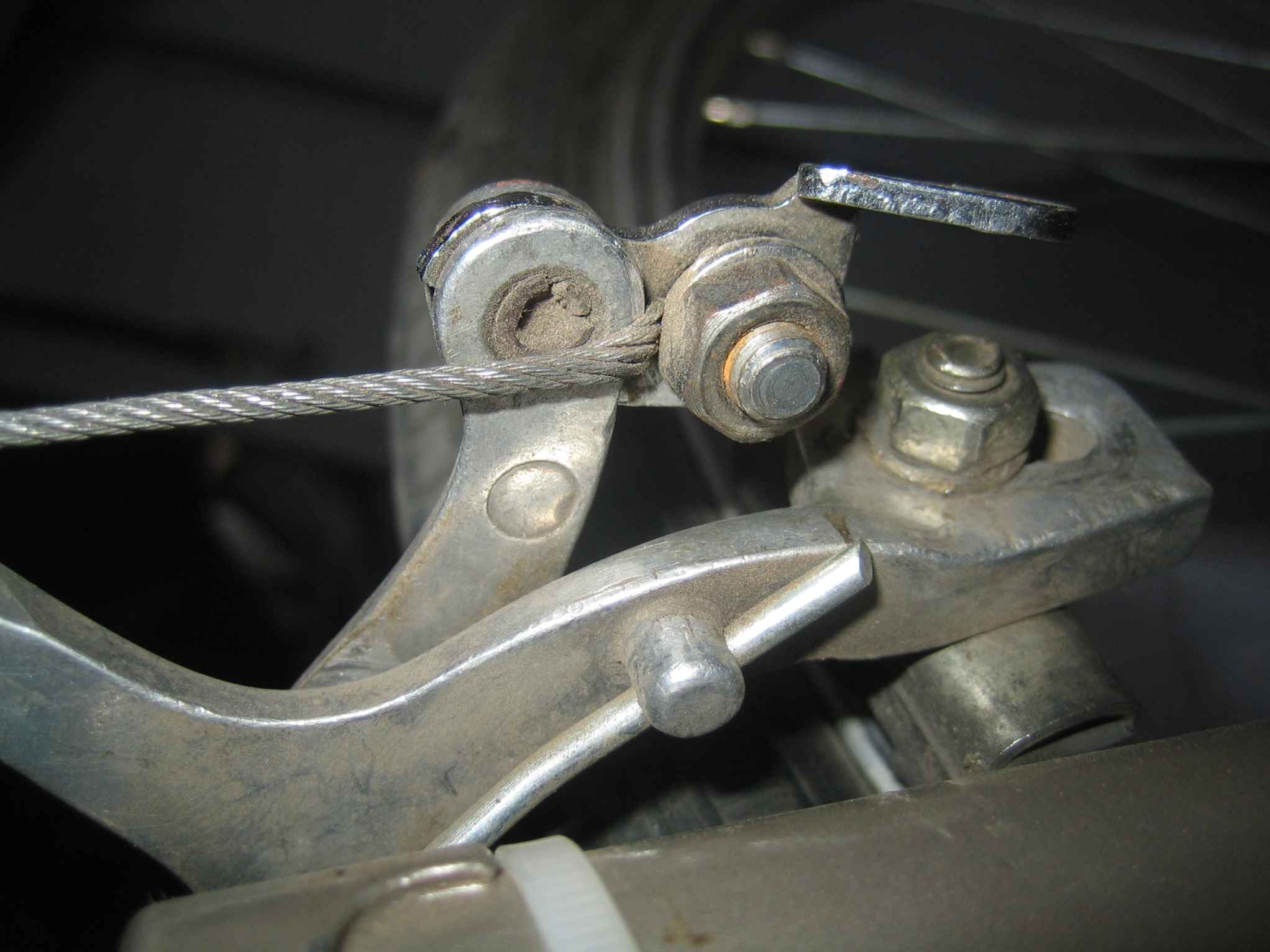 Да все там нормально - только болт крепления троса развернут на 180 - вставить его другой стороной, чтоб трос не ломало и все заработает. Кстати, с левой (по ходу вела) колодкой та же беда, может резинка выскочить - надо упором по ходу развернуть. На тормозе из неоригинального только гайка регулятора натяжения троса (должна быть алюминиевая полусферическая, как на фото).