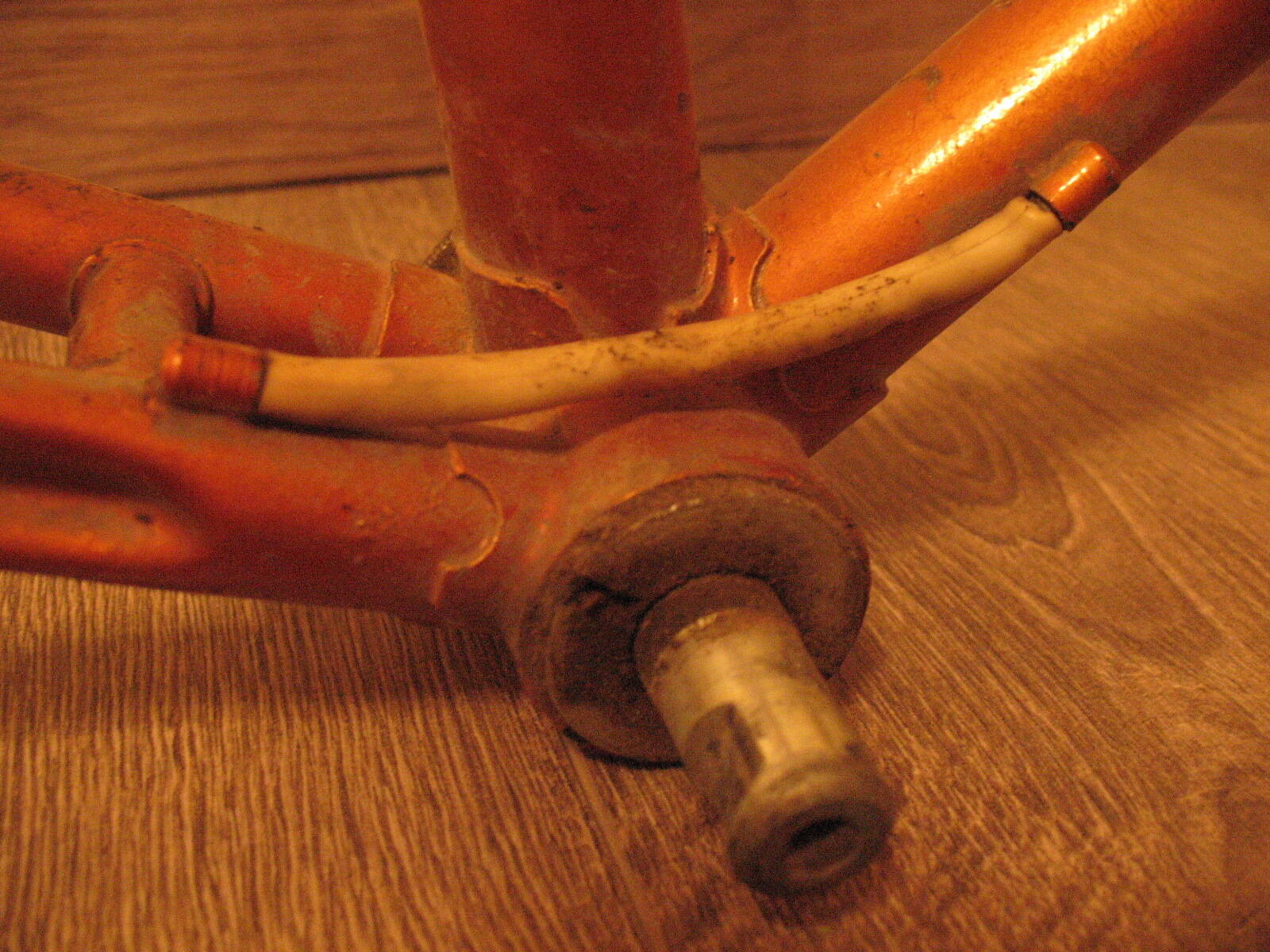Седло вообще зачетное - слегка потерто в задней части, но по всей поверхности родная краска. Кожа твердая как фанера, есть небольшие пятнышки коррозии в металлическом носике и следы черной краски на рамке :shock: подседел и замок как новые. С седлом работы меньше всего будет :D А вот над рамой придется потрудиться. Сегодня утром при посмотрел при дневном свете - похоже что вскрывали лаком, есть потеки местами. Наверное таки перекрашу, но в родной цвет и позже. Пока буду собирать компектующие.