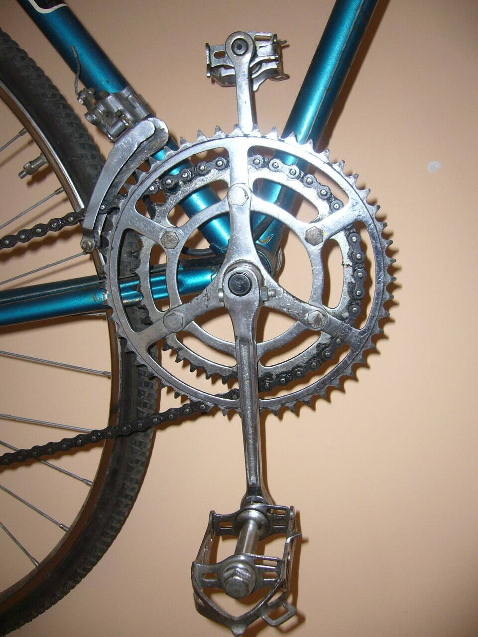 Первым этапом были заменены троса с рубашками, тормозные ручки, руль. В шатунах перерезана резьба на дюймовую и временно поставлены педали от моего прошлого вела. Отмыт слой литола с цепи и трансмиссии. В общем - приведён в ездящее состояние.