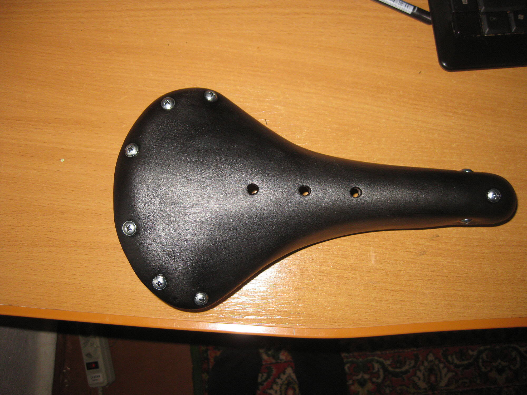 П.С. Чего боюсь. Два раза желатинил, седло стало звенеть как фанера, воск не сильно помог, боюсь, чтоб кожа не утратила гибкость и не порвалась от нагрузки жопы (80 кг), не приклеил внутренний лист кожи, т.к. когда желатинил он как-бы сам приклеился к чепраку. Думаю, не потеряется: он же тоже на винтах сидит. Надо будет - откручу и приклею. Ну и третье, надо чтоб седло не марало задницу, особенно после воска. Покатаюсь сначала в старых вратарских черных штанах, кстати, удобная вещь за неимением велоштанов- зауженные штанины и резинки на ступни. Плюс, мягкие вставки на коленях и боках- один раз помогло, когда положил вел на бок на гравии.
