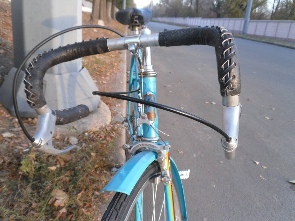 После раму зачистил, грунтовал в три слоя - грунт ГФ для металла (впервые столкнувшись с покраской труб - пришлось зачищать подтеки). На третьем слое приспособился. Красил алкидной "тикурилой" заколерованой в бирюзовый цвет- тоже три слоя с обязательной шлифовкой 1000 шкуркой. Дальше интереснее- деколи. Перед тем как затевать все эти покраски узнал что у меня на работе есть человек который как хобби занимается аэрографией, рисованием мелких картин. И в качестве эксперимента он взялся нарисовать на раме акриловыми красками деколи (трафареты к-х выложены на форуме). Рисовал долго - в перерывах между основными заказами. Но я терпеливый. Появившуюся текстуру маленьких эмблем я решил закрыть лаком. И это мероприятие доверил спецу - XTRчу, он же помогал и с наборкой колес. После сборка, регулировка. Обычную сингловую цепь пришлось удлинять, да, и замок я выкинул (он цепляется за пластины перекидки). Сделал кожаную обмотку, может не достаточно скурпулезно, а в качестве первого опыта. И вот сегодня- 7 ноября -первый выезд. Волнующие ощущения. Да Вы знаете. Перекидка работает - как сказать- более массивней- чтоб переключиться на большую звезду нужно сильней качнуть рычажком. Звезды 20-22-24 для харьковской езды вполне, хотя на Холодную Гору не заехал - но это скорее к вопросу физ формы. Да и все таки ЛКП получилось не очень устойчиво к сколам- так что вариант для слетов и настенного хранения.