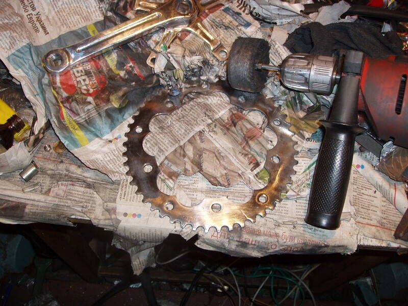 сломав несколько свёрл.. эээ..досверлил отверстия на теле втулки и забил туда пины от цепи. Если повторять конструкцию сейчас, я бы сделал одну шпонку, причём резьбовую. То, что звезда несъёмная (без болгарки), меня не парит. Т. к. нужного размера спиц не оказалось, пришлось покупать более длинные и откусывать головки, гнуть концы - всё видно на фотках.
