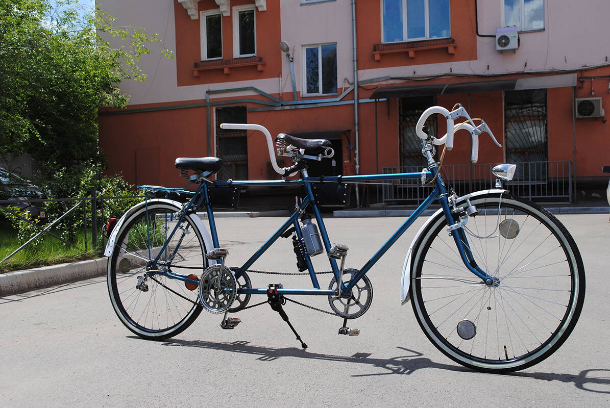 Задняя часть рамы — от велосипеда «Турист» (не претерпевает никаких изменений и от нее ничего не отрезается ,она приваривается без каких либо изменений, некоторые, например, отрезают рулевой стакан полностью и удлиняя трубы приваривают к подседельной трубе первой рамы и т.д.) В моем случае рулевой стакан "Туриста" распиливается вдоль точно посередине с правой стороны ,разгибается,плотно надевается на подседельную трубу "Урала" и фиксируется сваркой. Подседельный штырь не регулируется по высоте, просто вбит до нужного мне уровня, это в свою очередь придает повышенную прочность сварной сцепке, он вбит внутрь примерно на две трети, так что перекрывает по длине всю бывшую рулевую рамы Туриста, получается своеобразный палец. Между каретками проходит усилительное ребро в виде двух параллельно идущих труб,надетых с одной стороны на обрубки нижних перьев "Урала" до упора и заваренных по верху, с другой стороны трубы приварены к каретке "Туриста". Передняя часть выполнена из рамы велосипеда «Урал» 1978 г.в. Передняя вилка также от «Туриста». Обода колес — «Урал»; резина и спицы — от дорожной модели велосипеда. Предусмотрен тройной независимый контур тормозов. Рукоятка привода тормоза переднего колеса установлена на левой половине руля; рукоятка привода тормоза заднего колеса установлены на правой половине руля . Т.к. заднее колесо от «Урала» то имеет место старый добрый барабанный тормоз с внутренним расположением колодок и ведомую звезду на 19 зубьев . Тормозить им очень удобно, в планах поставить планетарную втулку чтобы при наличии пониженных передач для облегчения жизни на подъёмах не потерять возможность торможения педалями , но даже сейчас в более менее крутые подьемы односкоростной тандем способен взбираться самостоятельно. На нижней ветви цепи установлен компенсатор, что позволяет исключить требование жесткой синхронизации; уменьшает износ и вытягивание цепи при «жестком» усложненном профиле дороги. Под седлом водителя,на подседельном штыре установлен вынос для размещения второго руля, которое позволяет регулировать его установку по высоте и углу наклона ручек. На переднем и заднем крыльях установлены фары, питание которых осуществляется от двух динамо-генераторов, в планах поставить аккумуляторную батарею. На данный момент пройдено более 200 км , и можно отметить следующие характерные эксплуатационные особенности предлагаемого велосипеда-тандема: