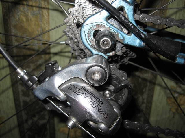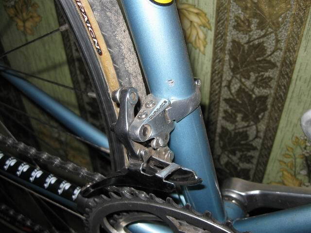 Рама паяная на трубах колумбус и узлах от тахиона.Трубы в сечении овальные(кроме подсидельной и рулевой).Оборудование сборное из трёх групп.Манетки и педали Shimano 105,передний переключатель-Dura-Ace,задний-Tiagra,подсидельник древний- Shimano 600.Втулки выточил мой знакомый,обода Alexrims AT400.Систему оставил ХВЗ с камповскими звёздами. Вот такое чудо природы.