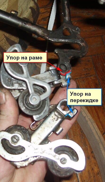 Но действительно перекидки ХВЗ ходят вокруг оси-болта крепёжного, упираясь в крайнем (ближнем к каретке) положении своим упором в соответствующий упор на раме. Что старая, что новая (раму от старой нечем в кадре держать было :D ). Может у Вас на чём-то упор спилен/отломан/стёрся?