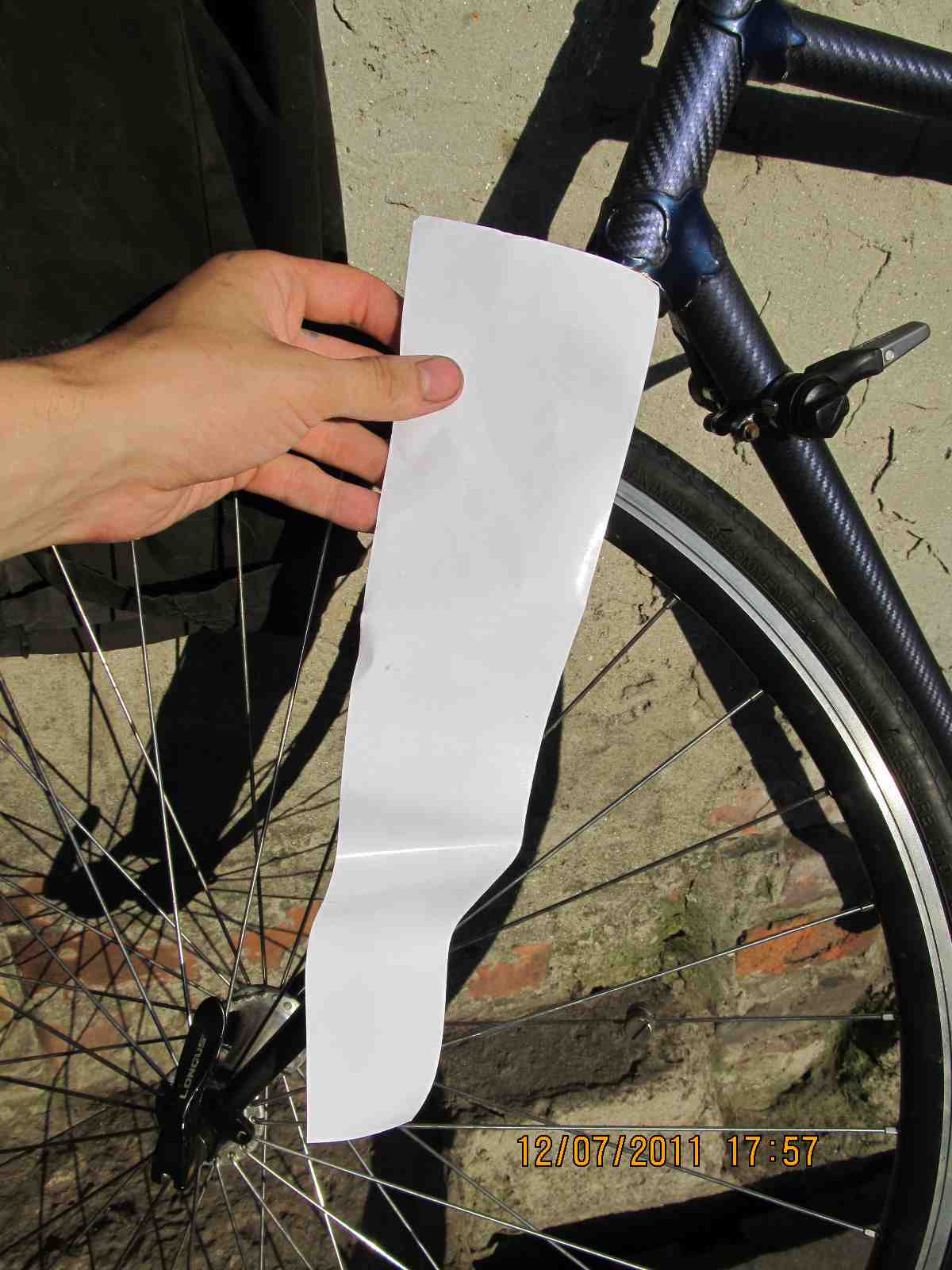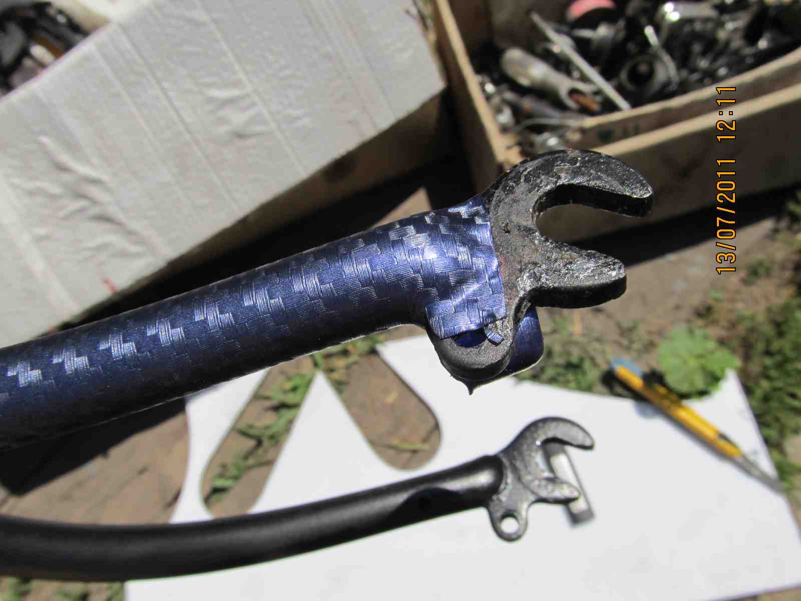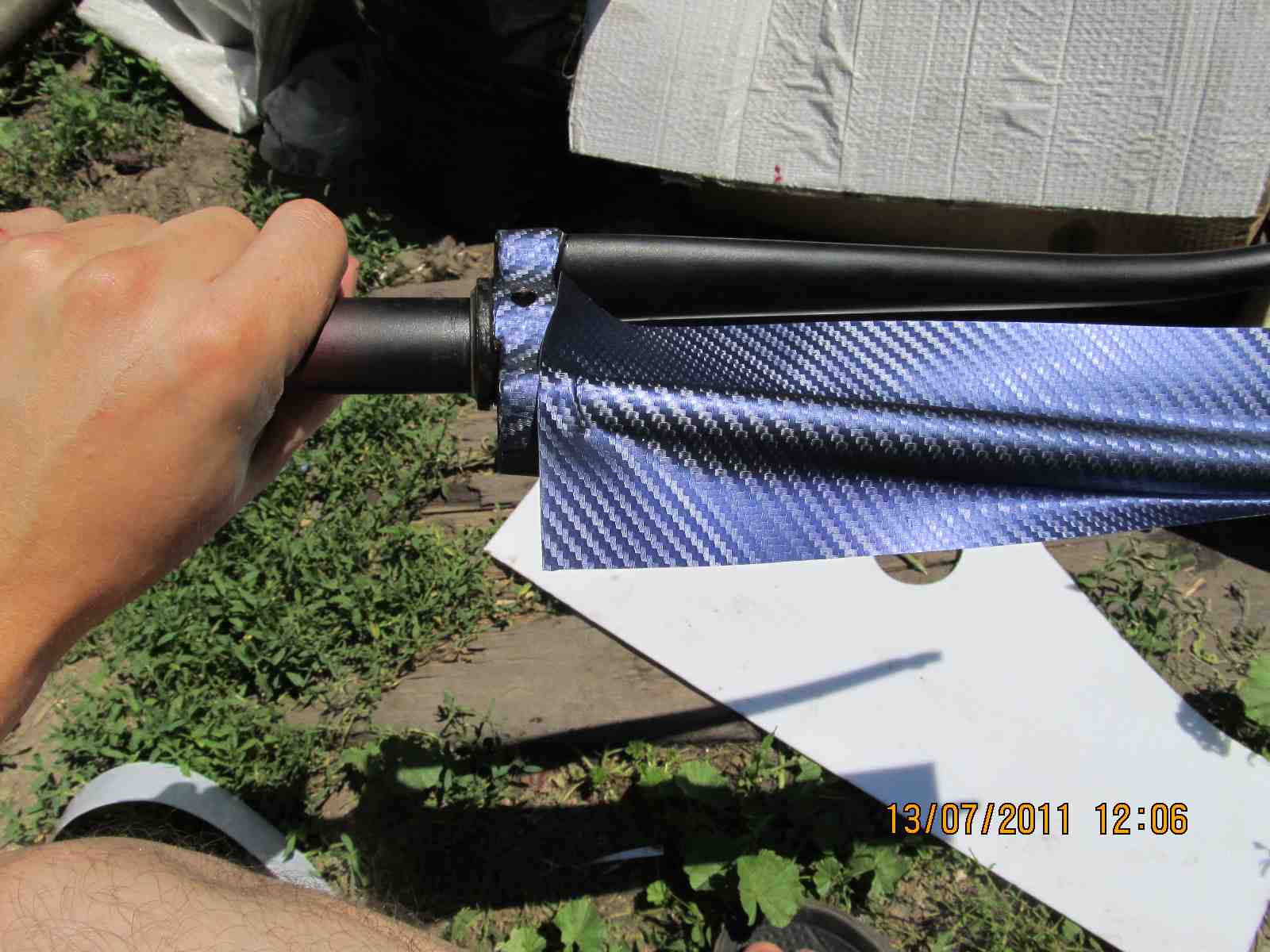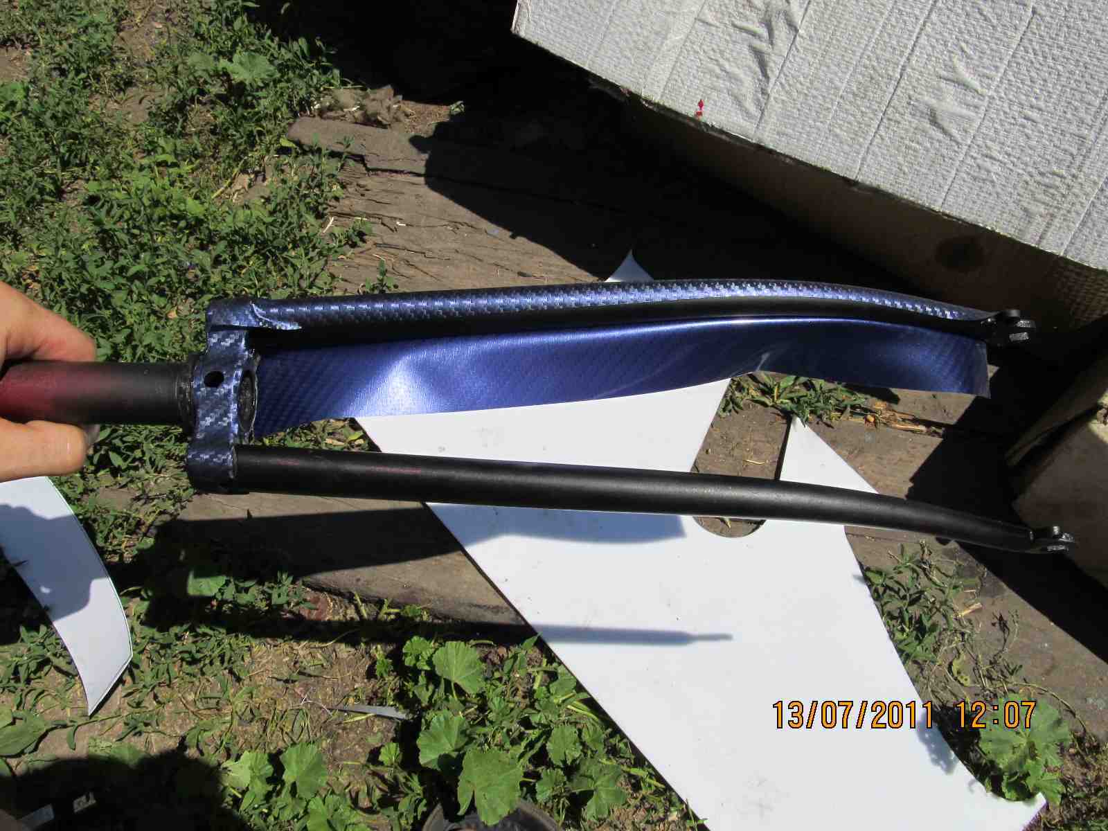 По советам решил переклеить вилку в синий карбон,в роде как нормально получилось,вел еще не собирал,как назло сорвалась резьба на петухе,потом решим.Ну вот собственно процесс:тут всё понятно,ничего сложного нет,главное чтобы были руки,материал,который я использывал-это пленка под карбон,синяя maxplus (http://www.youtube.com/watch?v=-4u8lNaXav4)китайского производства,она намного толще чем бельгийский 3D карбон,тянется хуже,покупалась здесь http://www.promdesign.ua/autostyling/ma ... nki/carbon),10х150см, мой инструмент-это нож,зажигалка,клей и еще солнце помогало прогревать пленку и вилку.Начал с того что вырезал шаблон по вилке с листа бумаги(индивидуально к каждой вилке),потом перенес его на обратную сторону пленки,наметил и отрезал,надо отрезать с запасом .Потом отрываю подложку с пленки прикладываю к вилке с фронтона и постепенно обжимаю рукой,выдавливая воздух,при помощи зажигалки растягиваю пленку на узлах,клеем проклеиваю стыки