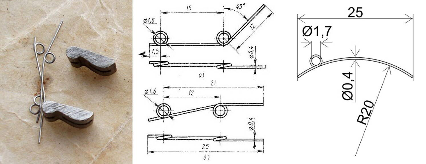 Рекомендовали делать из второй гитарной струны, на оправках - гвоздиках, забитых в фанерку. Я делал из старой первой струны, они были толще современных, делал вторые по рисунку, для Старта, и делал два витка на самой пружинке. "Хвостик", что нажимает на флажок - делал длиннее и загибал, чтоб во флажок он упирался не кончиком, а этим загибом. Смазка для ослабленных пружинок - ЦИАТИМ - 201, он "лёгкий". Так пружинки не стачивались у меня.