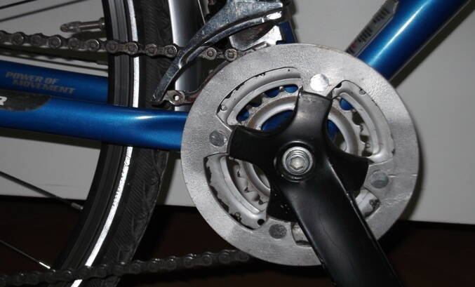 Валялись старые бюджетные шатуны СанТур, еще рабочие, высверлил и снял ненужную (терпеть их не могу) "тарелку" на 44 зуба, сделал и поставил вместо нее алюминиевый рокринг. Кто знает что за алюминий, но жесткий и толстый, должен выдержать всё. Несмотря на то, что поставил рокринг на алюминивые заклепки, упреждая вопросы скажу - не переживайте, внутри от звезды идут стальные бонки, так что не срежет.