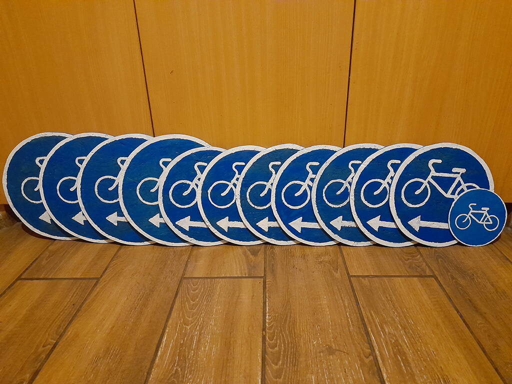 Что делать, дабы больше не было подобных поползновений? Летом, была похожая проблема в конце маршрута (примерно такой же длины участок), но, там мы узнали виновника, связались с ними и пришли к взаимопониманию, сейчас — увы..., кто-то другой катался. Я развесил на нескольких деревьях листики в файлах, где указано, что это именно велотропа, но, всё это временно..., во-первых — это неэстетично, во вторых — ненадёжно к погодным условиям. То, что я надумал сделать — это развесить знаки "велосипедная дорожка", штук 10-15 по длине всего маршрута. Делать буду из фанеры (или влагостойкой OSB), покрашу синей краской и трафаретом нанесу велосипеды. Может кто-то ещё что-нибудь посоветует?
