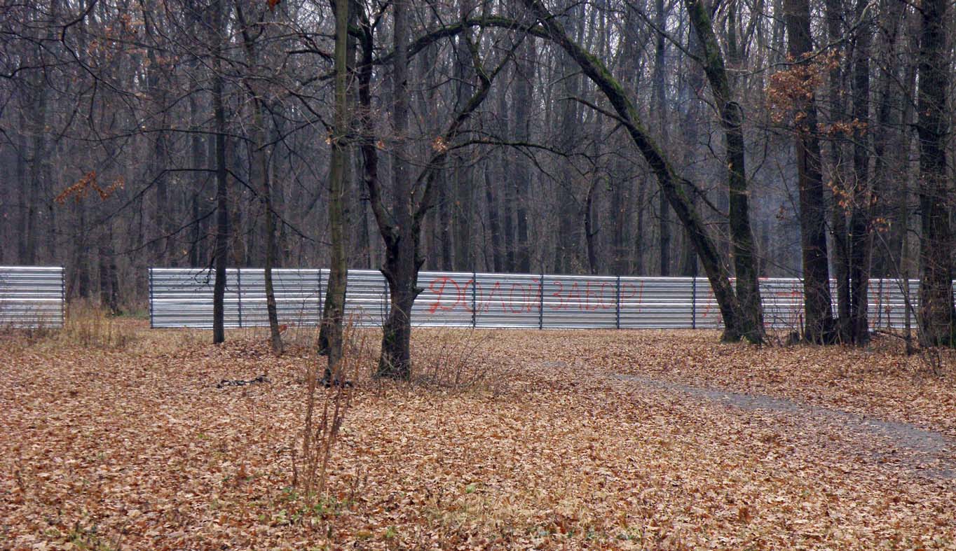 На прошлой неделе на Зенитовской поляне, в центре Лесопарка, появился новый металлический забор, охвативший обширную площадь девственного дубового леса. Здесь растут краснокнижные растения, обитают животные, занесённые в Красную книгу, растут дубы-долгожители. Зенитовская поляна – любимое место отдыха многих харьковчан. Здесь проводятся соревнования разных уровней: от любительских до профессиональных. Здесь поблизости расположена Олимпийская лыжная база Темп с замечательными трассами, некоторые из которых проходят по территории, охваченной забором.