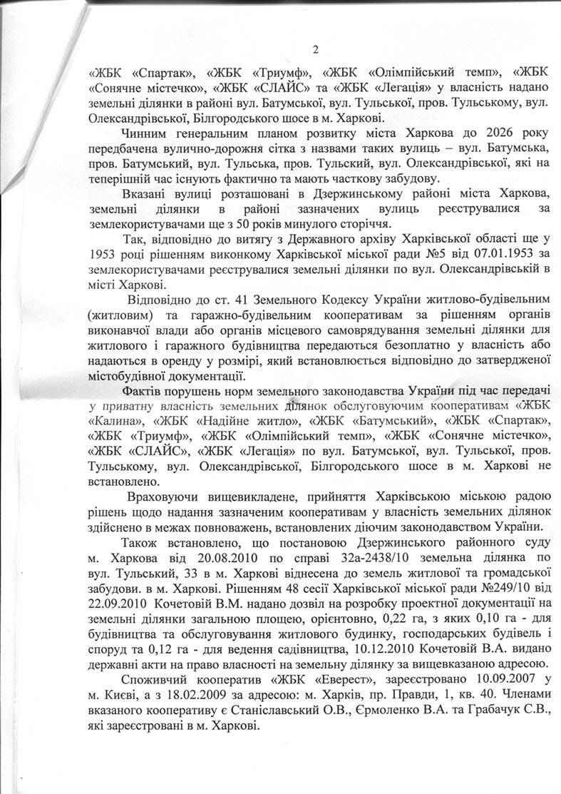 Первый момент, который должна была бы отстаивать правоохранительная система — это право собственности территориальной громады на эти рекреационные земли. Здесь гуляют сотни тысяч харьковчан и гостей города. Но прокурорские легко соглашаются, что это не рекреационные земли, а земли городской застройки. Эта легкость поражает! Второе, на что они обязаны были обратить внимание — что даже при получении земли, господа дачники не имеют права вырубать деревья (а без этого, понятно, дом в лесу не построишь), но правоохранители смотрят на лес и… не видят деревьев! Это ж какой-то дефект зрения получается, им не в прокуратуре работать, а глаза лечить! Третий момент, люди от балды провели по лесу какие-то мифические «улицы» которых там никогда не было и не будет. Но пинкертоны нашли, что в 50-х годах домик лесника кто-то приписал к несуществующей на самом деле улице «Александровской», на этом основании, оказывается, проходящие через лесные чащобы никем не согласовывавшиеся «улицы» могут существовать! Вообще, никогда не проводились ни общественные слушания, ни обсуждения проектов уничтожения Лесопарка, возведения каких-то мифических улиц и так далее. При этом общественное мнение в Харькове однозначно: год назад мы за несколько дней смогли собрать 12 тысяч подписей в защиту этого уникального природного комплекса, потому что к уничтожению Лесопарка не остается равнодушным ни один харьковчанин. Ситуация в Лесопарке давно получила большой общественный резонанс.