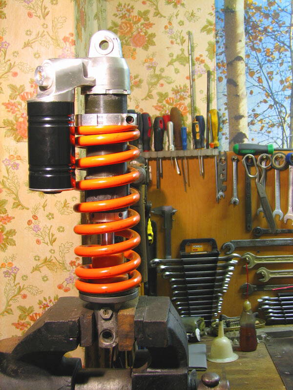 Ухо сбоку потому, что весь аморт смещён вправо. Тем самым освобождая место для корпуса паралонового воздухофильтра. Это компоновка такая, а не недостаток.