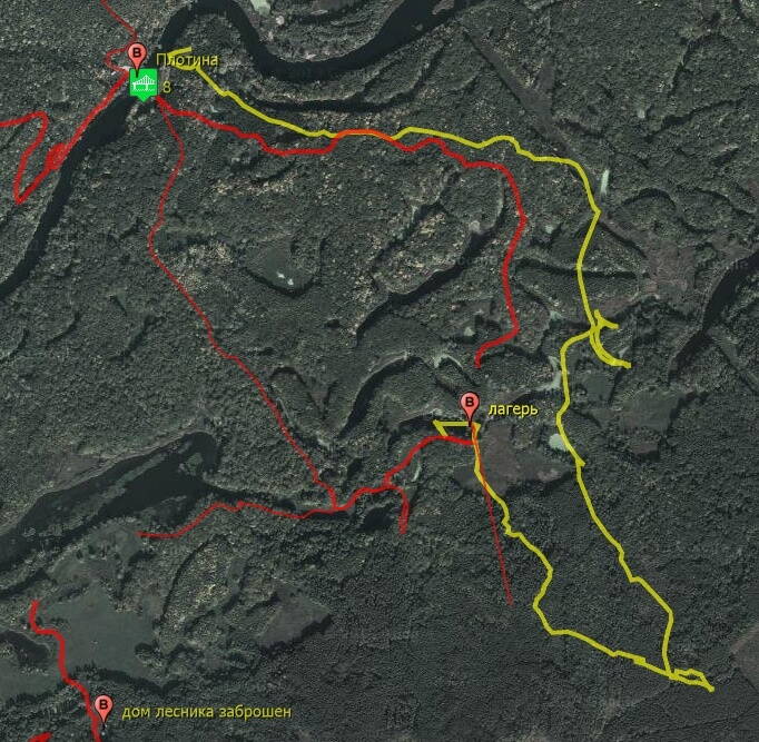 Желтым -это твой трек выезжал от озера, а красным -это когда заезжал на стоянку. Очень хорошо видна подобность треков со смещением неправильного трека 200 м на восток.