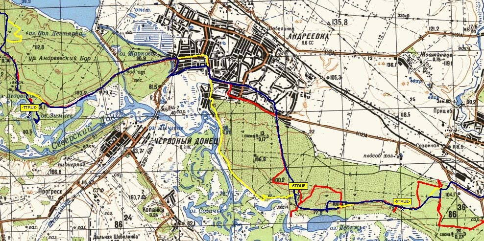 Наложил друг на друга все треки, полученные вчера в "Жасмине", по-моему очень интересная картина :smile: Красный - йа, желтый - Серж и Ко (трек от prostosergik'a), темносиний - Вейнгольд с Сергеем.