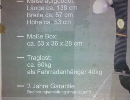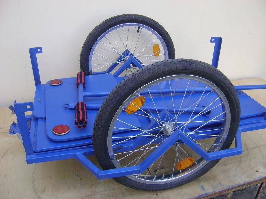 Моноколесный велоприцеп. Выполнен из бесшовных холоднокатаных стальных труб. Вес 10 кг. Диаметр колеса 16". Грузоподъемность рекомендуемая - 50 кг, предельная - 125 кг. Размеры площадки - 430х650мм. Разборной - съемное дышло и задняя вилка, легко умещается за шкафом. Изменяемый клиренс (как спереди так и сзади). Ход подвески 80 мм, гаситель колебаний.