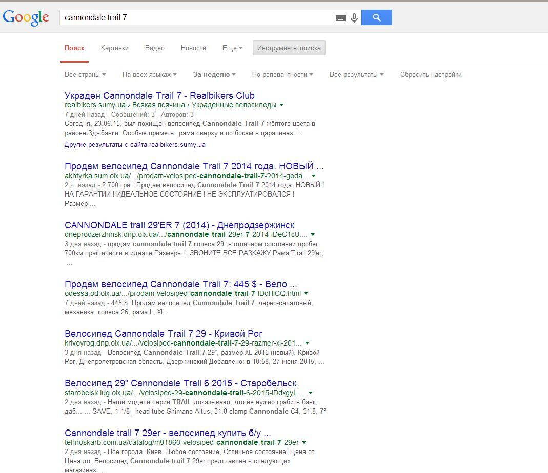 Совет: мониторьте через гугл. Вбиваете запрос вида "cannondale trail 7". В инструментах поиска ставите результаты например "за неделю" или "за месяц", можно отсортировать и по дате. В итоге получаем полный список тем на всевозможных сайтах. Ручной мониторинг форумов будет эффективнее только в случае, если топикстартер назовет тему по-тупому типа "продам крутой вел кэнондейл".