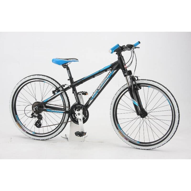 Чёрно-бело-голубой раскраски. Шины с белой окантовкой. Седло голубое с чёрной окантовкой. На руле велоспидометр.