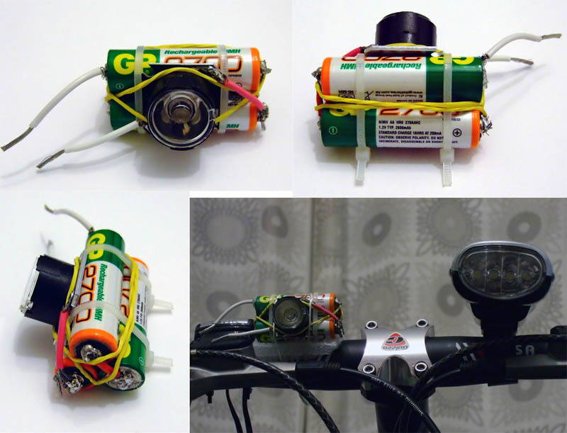 3 аккумулятора(у батареек больше напряжение, есть шансы спалить диод, да и заряжать их нельзя) соединяются пластиковыми стяжками, спаиваются последовательно, 1Вт светодиод с коллиматором, резинкой канцелярской пристегивается к аккумуляторам. Гурманы могут добавить выключатель(нарушив принцип минималистичности), хотя вполне работает скручиванием проводков;)