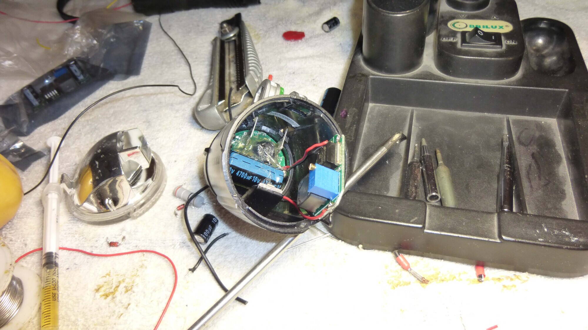 всем привет!!!!тоже себе соорудил фару.буду испытывать.скажите на малых оборотах колеса есть пульсация-так должно быть? спасибо VALSERGу за изобретение.жду хорошей погоды чтоб тестить.фару пришлось перевернуть вверх ногами-не учел что вход проводов будет мешать тормозам.но вроде и так нормально.ПОТЕСТИЛ-ВСЕ ПУТЕМ!!!