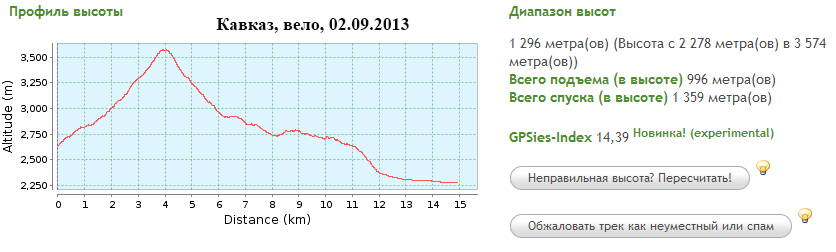Ну, а с треками и профилем... вариантов очень много. Но, как доступное для всех потом, например http://www.gpsies.com. Забросил для примера: http://www.gpsies.com/....... (так как НЕ мое, удалил через пару дней после публикации :pardon: ). Там потом можно скачать в любом формате. А, ну и обычно там же в редакторе чищу треки убирая "скачки" точек в местах привалов, они как раз добавляют несколько сотен метров набора высоты за день часто. А потом...можно даже очень просто: PrintScreen и Ctrl+V. :-P