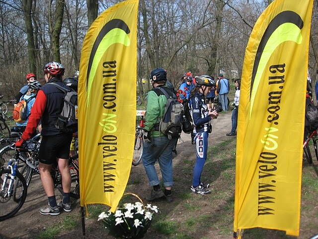 Для зарегистрировавшихся по интернету был отдельный столик и мы очень быстро обменяли 50гр на номер и путевой лист. Потом нам разъяснили что есть автобус-камера хранения, куда мы и сдали лишние вещи. Возле автобуса, за углом мы развернули флаги клуба и выехали на место сбора, прохожие реагировали на хлопки ткани развивающейся на ветру и оборачивались. Флаги были установлены на месте сбора. И наши велосипеды под флагами (застолбили место).