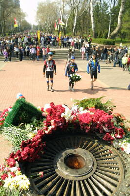 После такого развития событий к нам подошел организатор сотки, он представился Леонидом, как оказалось он тоже был любопытный, после того как он всё разузнал, он спрятался в массе прибывающих людей. Через некоторое время Леонид появился возле наших флагов с корзиной цветов, с словами –Раз вы такие красивые, вам и цветы возлагать к памятнику. Поставил корзину и пошел заниматься своими делами.