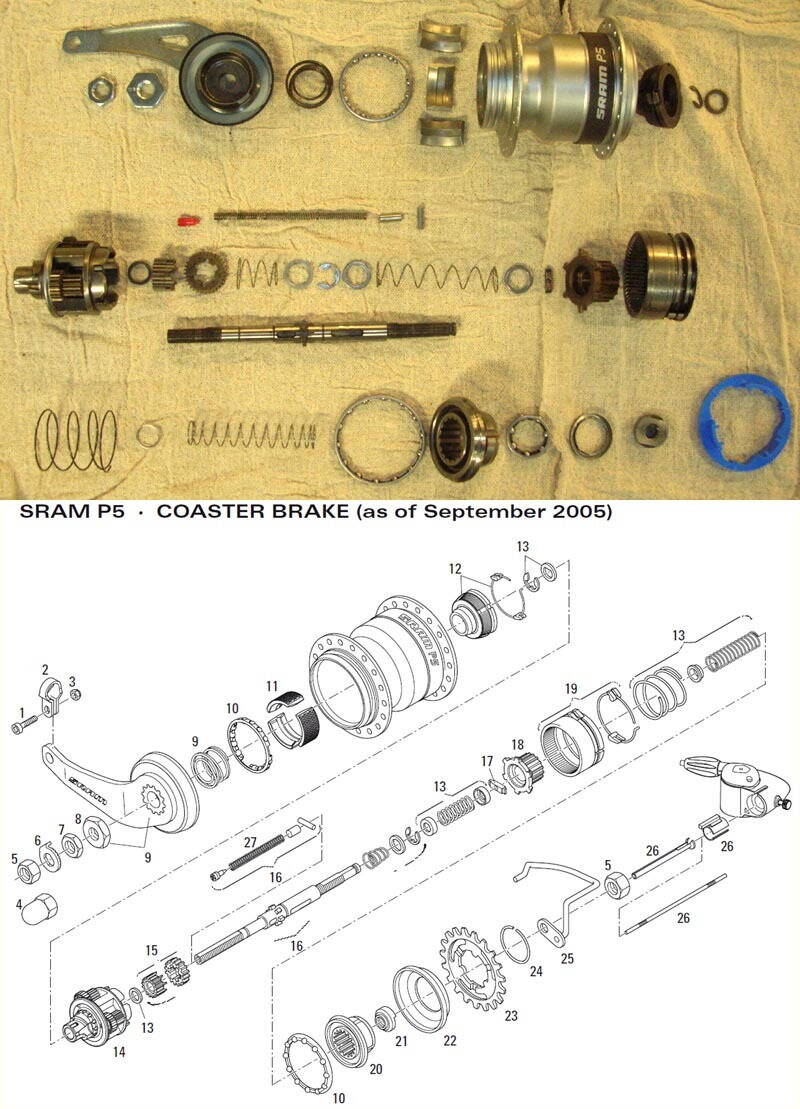 По поводу смазки. Перечитал немало тем, поспрашивал в магазинах - смазки специальной нет. Я взял обычный свежий мягкий литол и пошел по своему пути. Перед сборкой я руками промазывал со всех сторон каждую деталь, получался тонкий слой литола везде. Особенно тщательно нужно смазывать звездочку-корону, которая лежит в основе переключения. Довольно обильно я смазал сами планетарные звездочки - но без излишеств. Особенно обильно я заложил литол только в обоймы подшипников. Как только я все промазал - в руках проверил переключение. Оно работало без нареканий. Собачки и дорожки собачек я смазал микроскопическим количеством моторного масла - пальцем. Тормазной механизм я слегка смазал тем же литолом. Сборка превзошла все ожидания. Колесо вращается свободно, грохота механизма не слышно. Боялся, что будут проблемы с переключением - но их нет. Появился другой нюанс - не знаю в связи с чем, может быть, в связи с тем, что втулка была до крайности грязной - раньше передачи переключались бесшумно, а теперь я слышу довольно громкий щелчок переключения, если делаю перебор передач вверх. То есть, пружины двигают все с большим запасом мощности, и нигде литол им не препятствует.