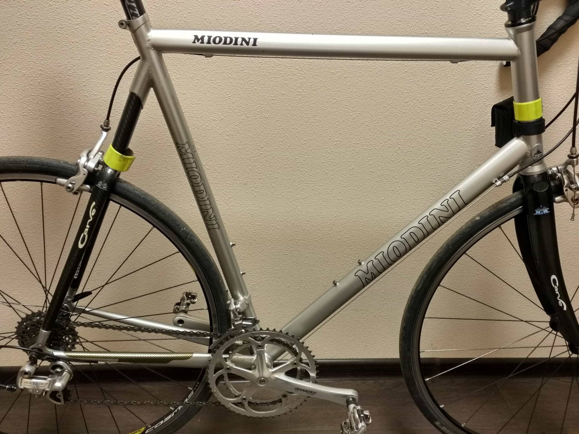 Карбонові пера додають комфорту ,металева рама твердості , короткі задні пера - різкості на розгоні , виглядає на "закос" під спортивне використання .А що там за матеріал труб , по зварним швам більш схоже на сталь або титан ? http://www.miodinibike.it/galleria/ Не знаю , але не виключено , що Міодіні замовляв раму в стороннього виробника і ставив своє клеймо .