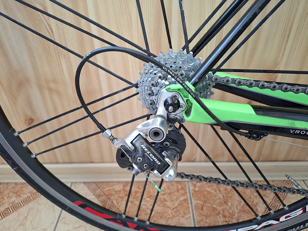 Стан- технічно все в ідеалі- фреймсет та компоненти. Косметично- присутні незначні потертості, подряпини здебільшо в районі рульового стакана від рубашок перемикання, та в районі каретки імовірно від потрапляння ланцюга між зірками системи та рамою. Фреймсет карбон без ударів, без ремонтів. Обслужений, мінялись тросики, рубашки на оригінальні Campagnolo недавно. Касета Campagnolo veloche майже нова. Ланцюг не розтягнутий Campagnolo Record (щє один такий самий б/в в комплекті (міняю ланцюги по колу)). Зірки системи компакт 50-34 також в чудовому стані.