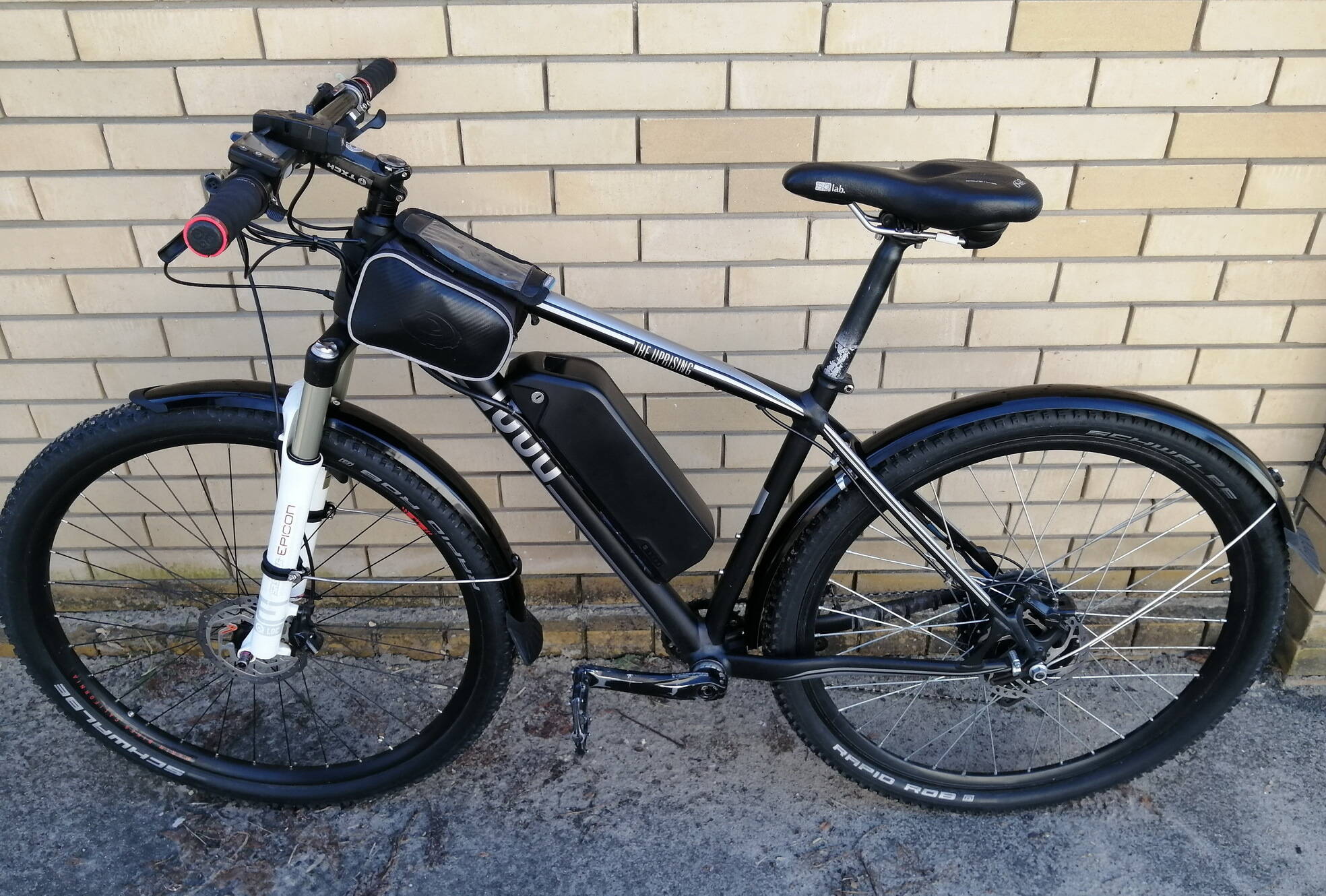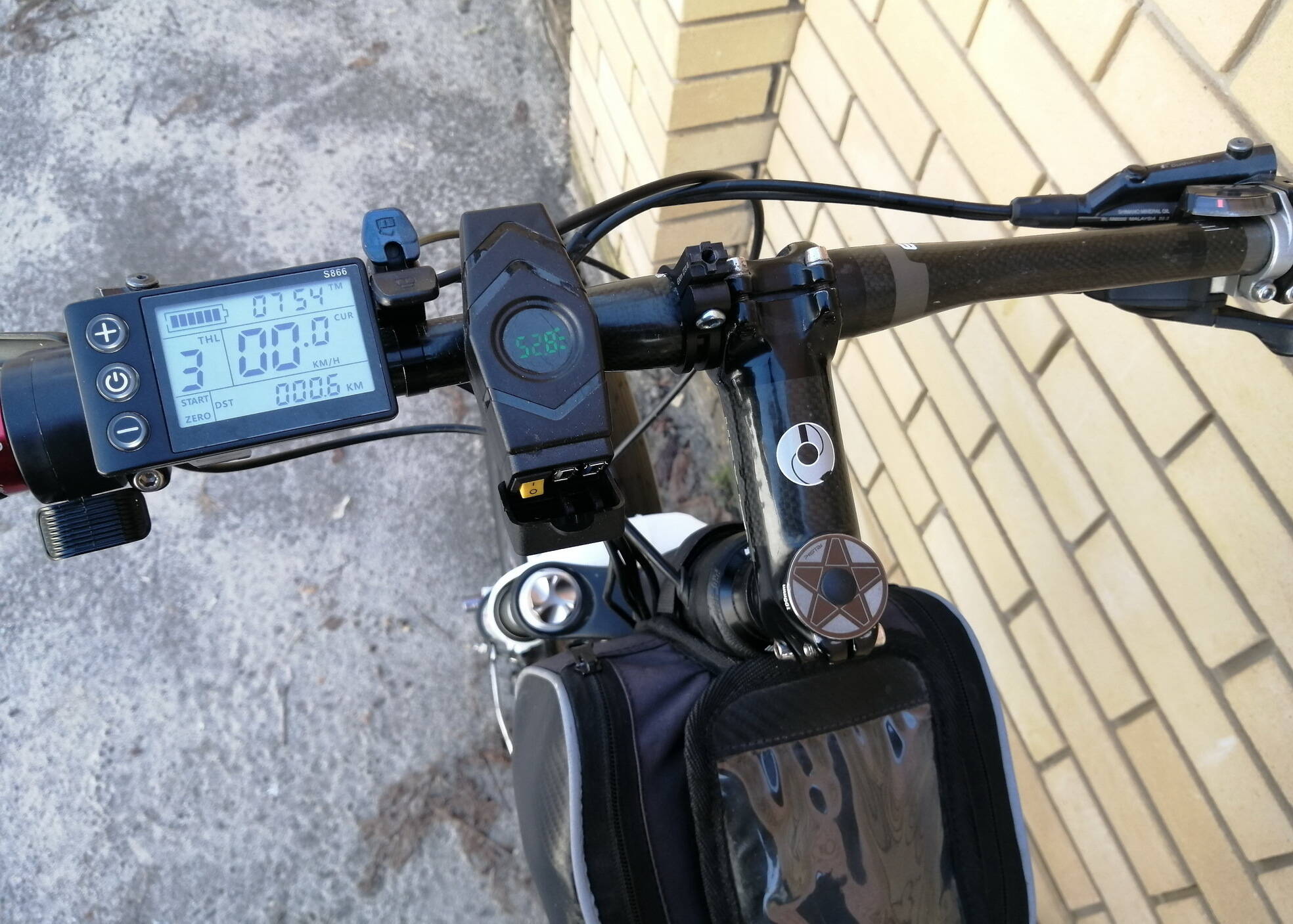На руле установлено устройство, показывающее вольтаж аккумулятора (чтобы видеть реальный остаточный заряд) с двумя USB выходами для зарядки телефона и фары (можно использовать батарею в качестве power bank).