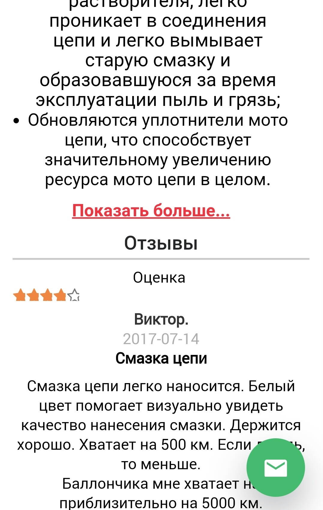 остались все довольны. Особенно радует всегда чистая трансмиссия, грязь не налипает как на цепь смазанную обычным маслом. Что касается пробега, то мнения разделились, да и манера езды немного разная. По моим личным ощущениям смазки хватает до 50/80 км по грунтам/асфальт. Использовал абсолютно новую цепь хт, предварительно вымытую от заводской смазки. Мой приятель говорит хватает до 140 км. Спасибо)