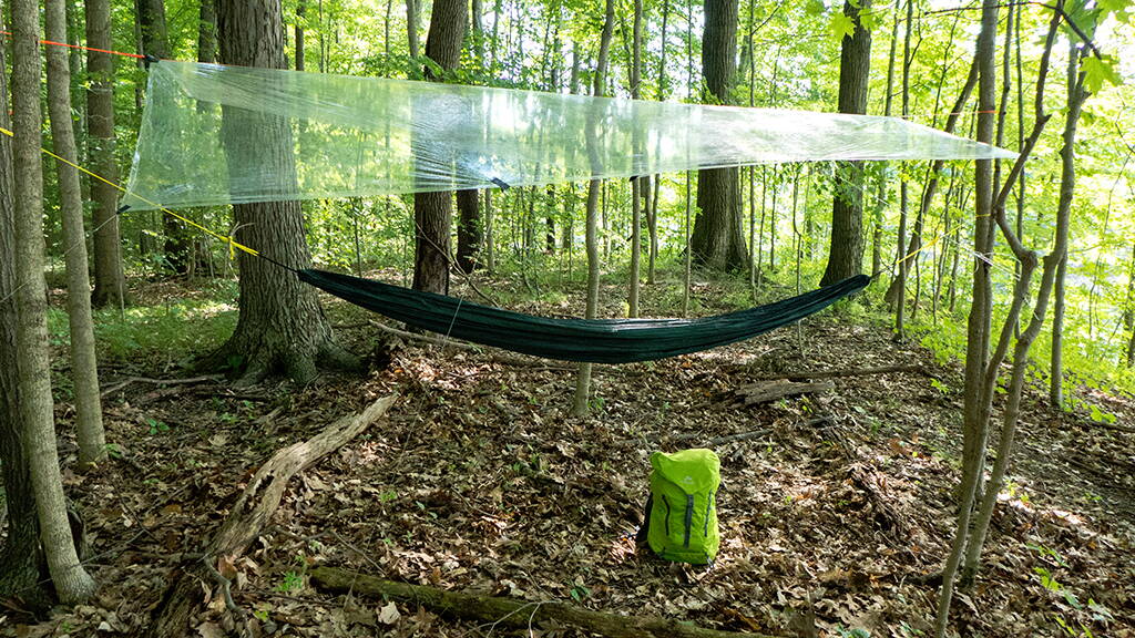 Можно применять как тент над гамаком или дополнительный тент на палатку.