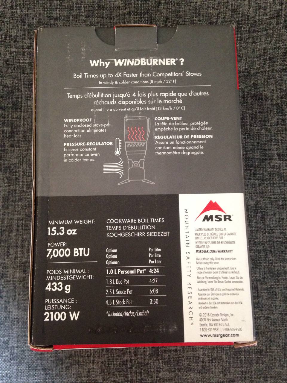 з особливостей: повний (!) вітрозахист, тут на відео тестували цю систему в порівнянні з Jetboil, так ось Jetboil фактично погас, а MSR продовжував працювати (youtu.be/Vssk8PikE2M), зручний та довгий регулятор полум'я, редукторний регулятор тиску (дозволяє працювати на повну силу поки газ не вичерпається, або в мороз), продумана конструкція казанка, яка дозволяє значно підвищити ККД, ніжки під пальником для стабільності. ціна у магазинах від 10500грн.