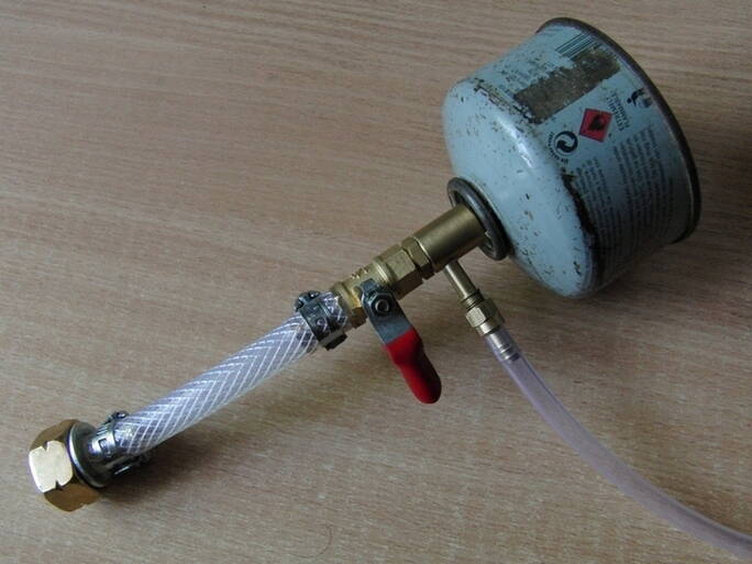 Итак, нужно накрутить переходник на баллончик, перевернуть баллончик вверх дном и подогревая руками стенки баллончика, вылить весь конденсат и стравить остаточное давление газа - это нам поможет быстрее залить газ. новые переходники можно сразу прикрутить на баллон, прикрутить баллончик, накрутить стравочный шланг на клапан и перевернув баллончик на гибком шланге, вылить конденсат через тонкую прозрачную трубку - можно в пустую пластиковую бутылку, опять же, подогревая баллончик руками.
