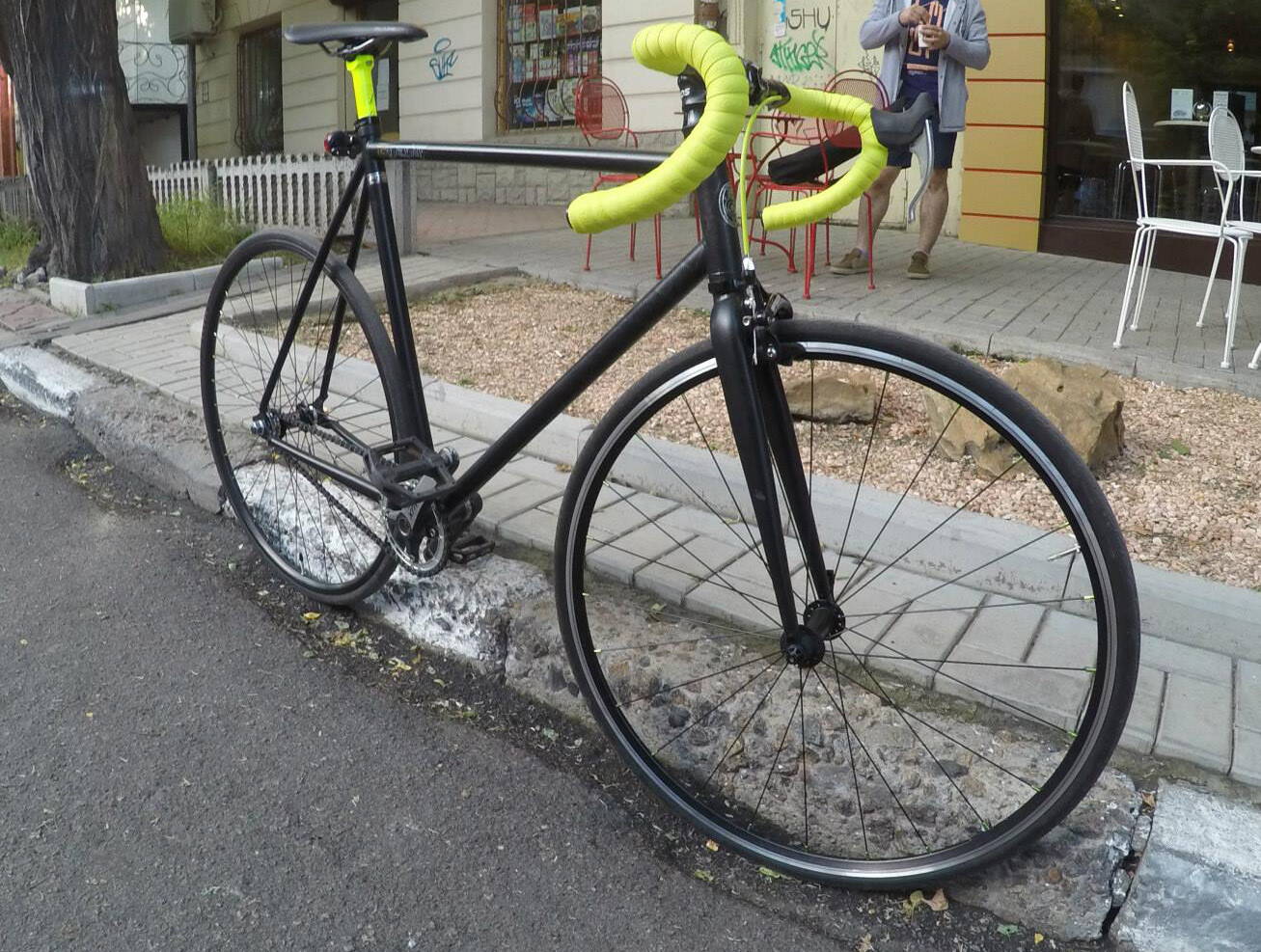 - перед: обод Mach1, втулка XRP, спицы FireEye, нипеля зеленые FireEye, резина Rubena