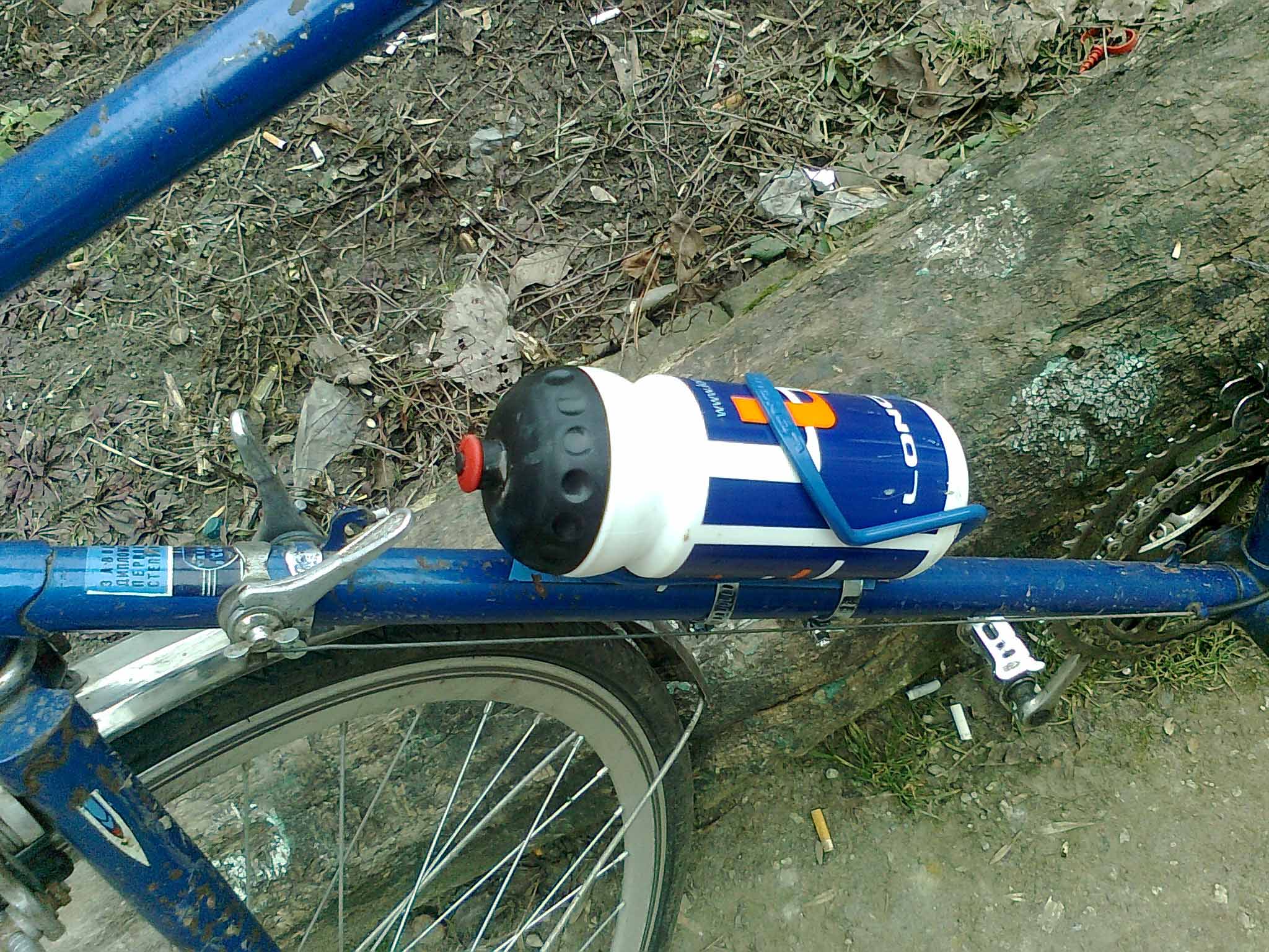 На флягу и флягодержатель потратил что-то около 50 грн, брал вместе с насосом, велокомпом и прочей мелкой фигней, все равно на сумму доставки это не влияло, получил добротный, крепкий держатель синего цвета и пластиковую банку с синими цветами, не рассчитал длины хомутиков строительных, поэтому прикрепил на заднее перо - получилось интересно, но банка вся в грязи )))
