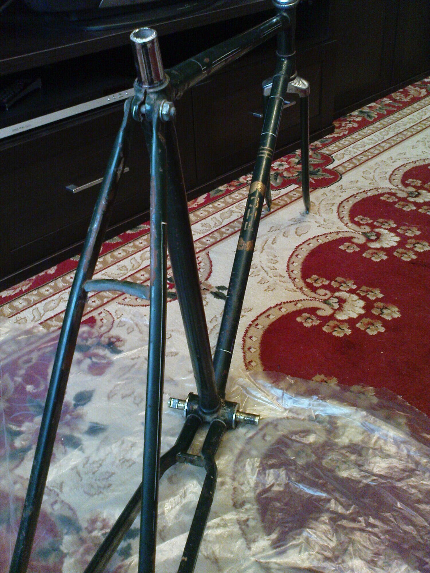 С Владом К я уже связался, но он пока занят :) А насчёт рамы - я большой ценитель ретро вещей, к тому же мне очень понравился сам велосипед. Хочется именно восстановить максимально близко к оригиналу и получать эстетическое удовольствие :) Да, работы с ним очень много будет, у меня вообще кроме рамы ничего нет по сути родного, даже шильдика нет и вилка там от другого велосипеда, баллончиком крашена, но как то за то время, что он у меня в коридоре провалялся, я с ним сроднился уже, чтоль... :) Навесил на раму пока ПВЗшные железки, чтоб спотыкаться об них поменьше, вот что вышло: