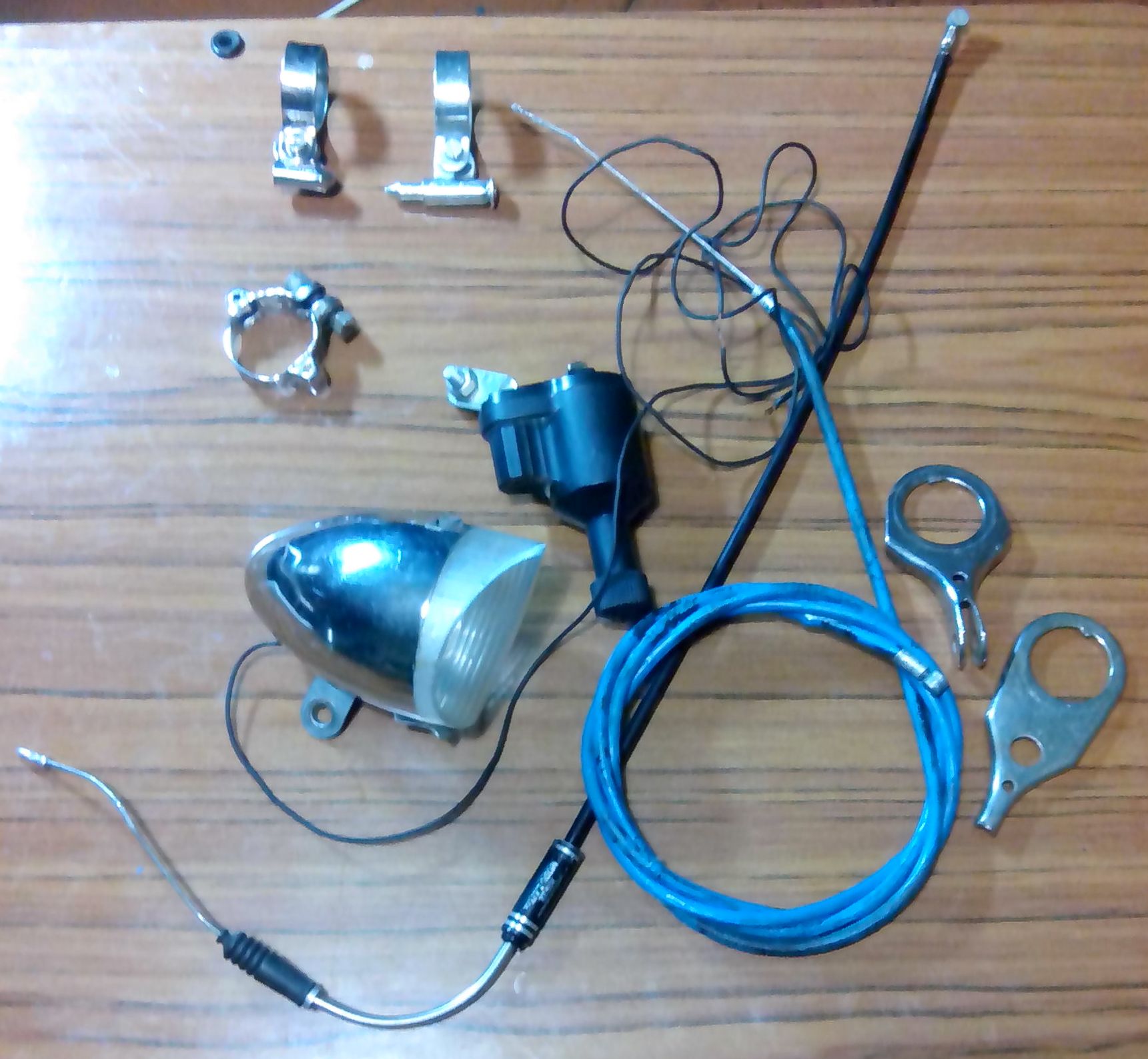 - для Густава передний кронштейн под тормоз (даже два разных), подседельный хомут и практически новый трос заднего тормоза (рубашку зачем-то покрасили синей краской);