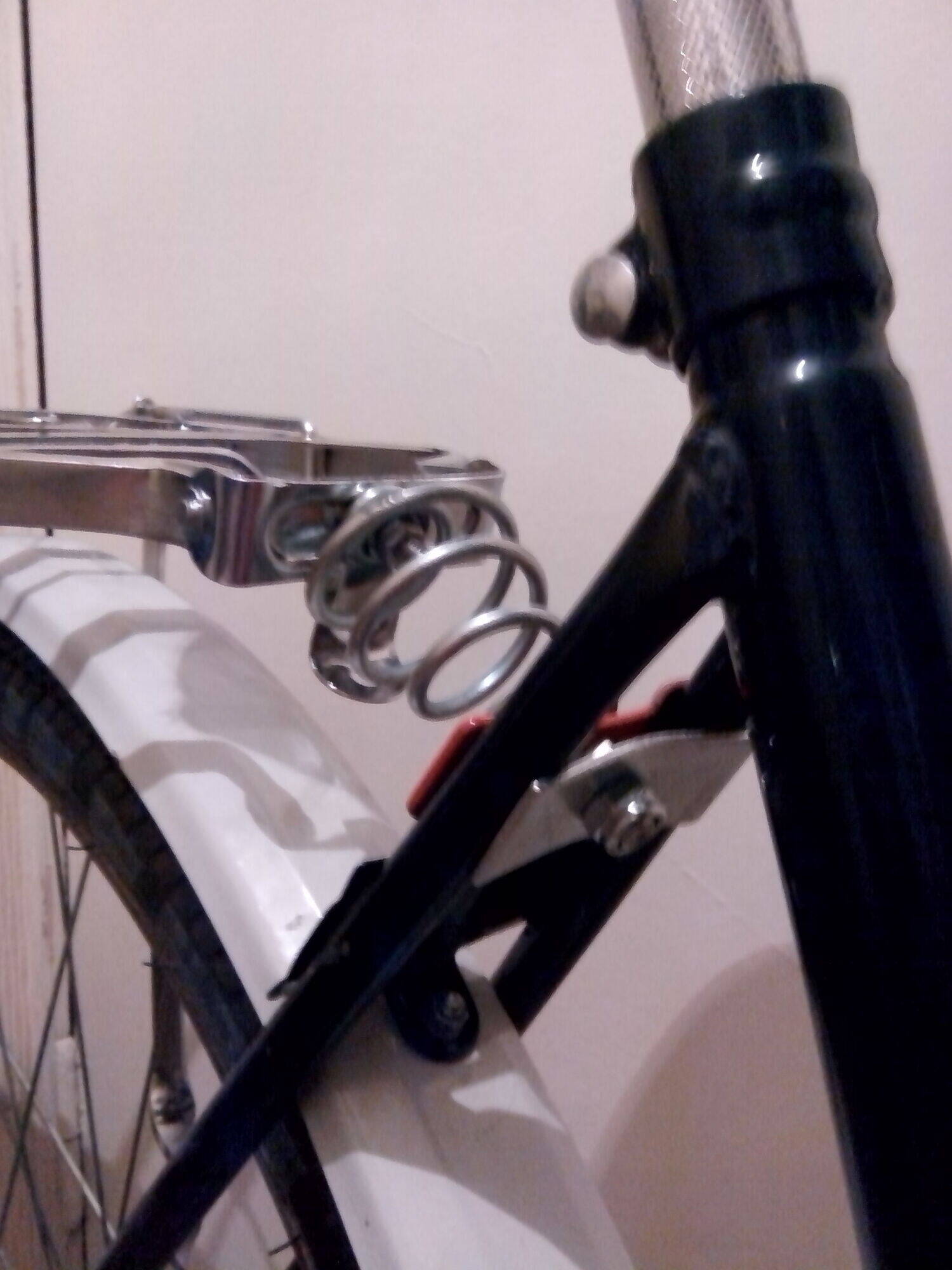 На мой взгляд, если ставить пружину на багажник то более вертикально, тогда пружина работала бы в правильном направлении, на сжатие, а сейчас она работает в первую очередь на изгиб а уже потом на сжатие.