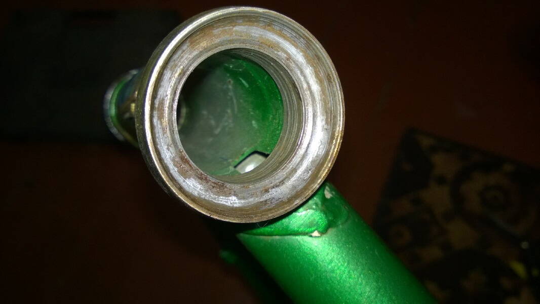 В общем я попробовал выбить нижнюю чашку, что у меня никак не получилось, и решил что не такая она и плохая эта чашка. :D Помазал ее внутри преобразователем ржавчины, высохло, похоже это не то что мне нужно:) счищу эту серую пленку мелкой наждачкой. Короче запрессованные детали трогать не буду, ну их:) На вилке нашел непонятности, то ли трещины, то ли что... Пытался выгнуть левое перо руками, как и ожидалось оно сделано достаточно крепко чтоб не гнулось РУКАМИ:) может на туристе и получилось бы но на СШ не вышло, пружинит, перемерял, ничуть не растянул. Может оно и не такое кривое как мне показалось :)))