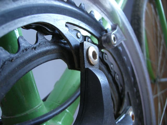 Седло с подседельной трубкой поменял сразу, трубка была очень короткой, седло, даже вспоминать не хочу, кривое, розбалтывалось постоянно. Руль поменял на прямой с рогами, вынос оставил родной. Тормозные ручки неизвестного происхождения, но изготовлены добротно, манетки та же фигня, но вполне устраивает. Систему сменил не сразу, год отъездил на родной со стальными шатунами под клин, и звездами вроде 52-42 точно не помню. Скрипела страшно, ничего не помогало, пришлось заменить. Заменил вал на квадрат и поставил дорожную систему Shimano FC-A050 39-50. Сразу не встала, пришлось переделать. Система не разборная, звезды приклепаны к пауку, пришлось высверливать заклепки и переставлять звездочки ближе к раме. В результате очень даже ничего получилось. Посадочное место под звезды стандартное (паук пятилучевой) теперь можно и звезды менять если захочеться, и вроде уже хочеться (39 уже мало).