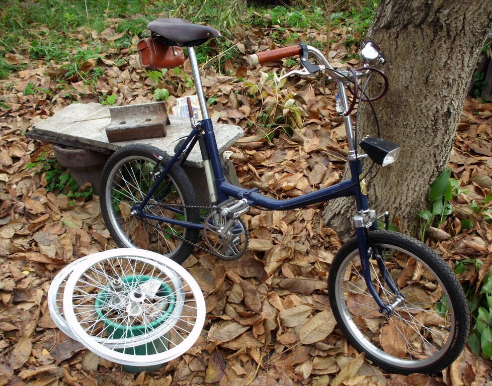 Ностальгический складной Минск моего друга претерпел небольшую, но важную модернизацию: современные высококачественные алюминиевые втулки и высокой прочности противоударные гоночные обода оттправлены по назначению - к его тёще в деревню на тачку навоз возить. Их место заняли нормальные колёса - на широких родных одинарных ободах и вечных втулках - передняя советская дорожная, задняя - Турист, переделаная на сингл. Повезло - у меня завалялась звезда от Спутника на 16 зубов - она широкая и вообще хорошо дружит с сингловой цепью.
