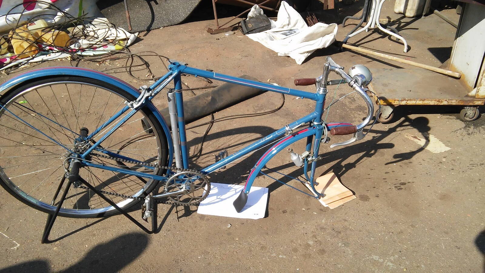 Работы - полная разборка, чистка, дефектовка, замена подшипника передней оси, замена обеих камер, тросика переключения, переспицовка переднего колеса на спицах ХВЗ, окраска переднего крыла и перемычки рамы с нанесением полосок и цировок (совместно с уважаемым Владиславом, в смысле он делал, а я .....помогал:), изготовление брызговика. Остальное оригинал.