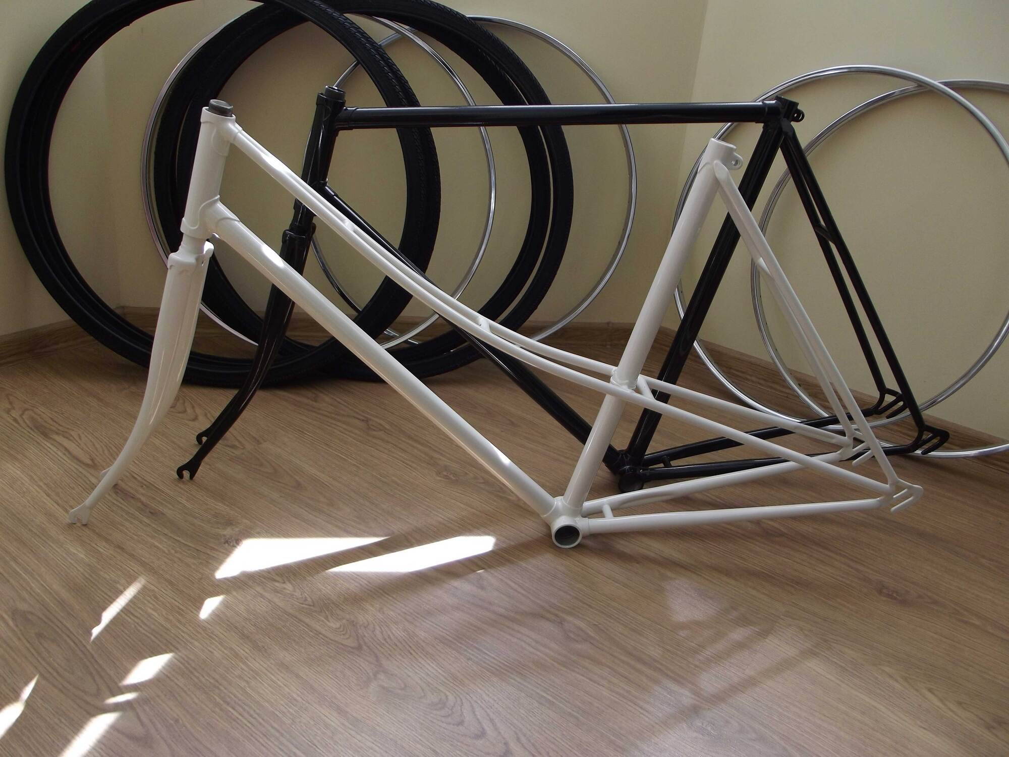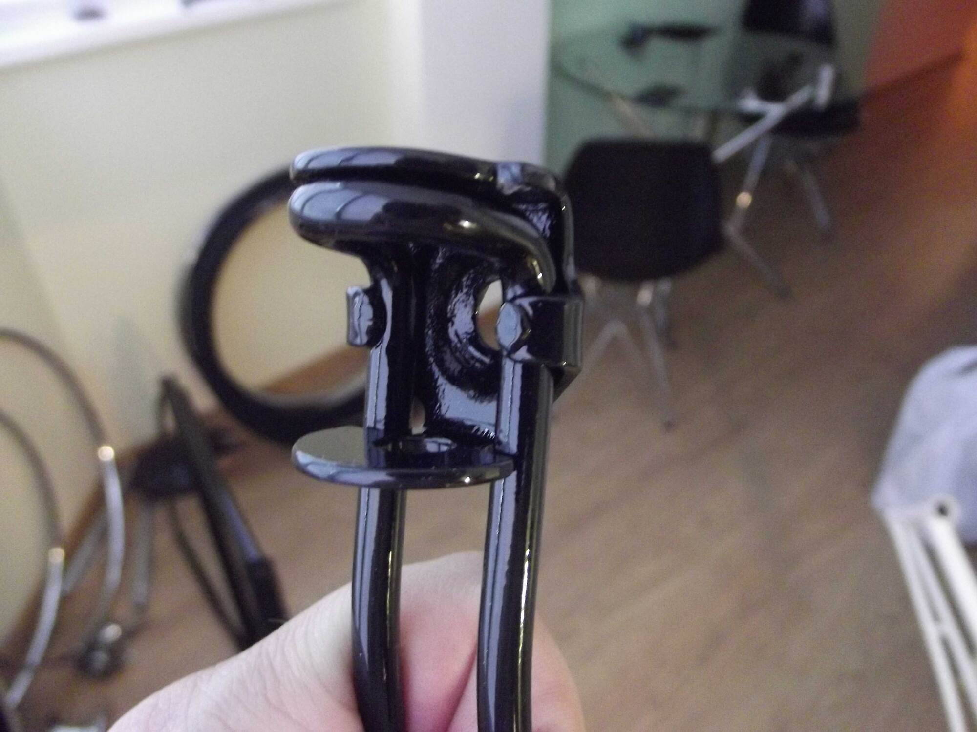Практически без изъянов. Есть по 1-2 коцки на каждой раме, на торцах труб, как будто стукнули обо что, а также на каждой детали (в отверстиях) - небольшой след от проволочки для подвеса в термокамере. Резьбы закрыли почти везде (три раза повторил) - в результате пару витков в каретках прокрашено, и полностью закрашена резьба на задней мет части Брукс (вроде как снимается родной гайкой).