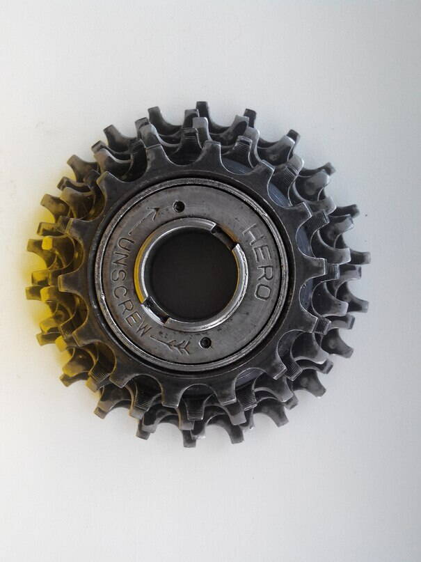 Есть у меня 2 трещетки. Одна - производства ХВЗ с шагом в один зубец: 13-14-15-16-17 (понятно, что колени будут страдать больше, да и подходит она для трассы, а не для города. Но она в лучшем состоянии чем другая) и индийская трещетка НЕRO с шагом в 2 зубца: 14-16-18-20-22 (более - менее пригодная для передвижения в условиях города, но со следами эксплуатации).